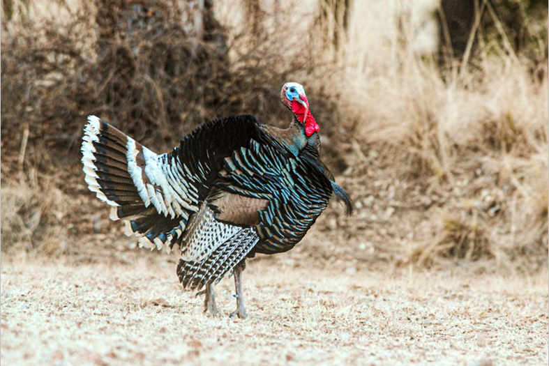 Adult male turkeys are typically larger in size and more colorful than their female counterparts, with colors of red, white and blue being noticeable on their head and neck. A male turkey’s feathers also will be closer to black and have a more vibrant sheen, while a hen turkey will generally be more brown in appearance. Do not assume a bird is a male if it has a beard – about 10 percent of hens also can have beards.